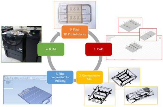Additive Manufacturing (AM) process steps followed to obtain the physical final device. STL files are provided in the Supplementary Materials.