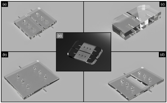 Rendering of the: substrate (a), cover (b), plastic optical fibers’ (POFs’) support (c), mask (d) and assembled device (e).