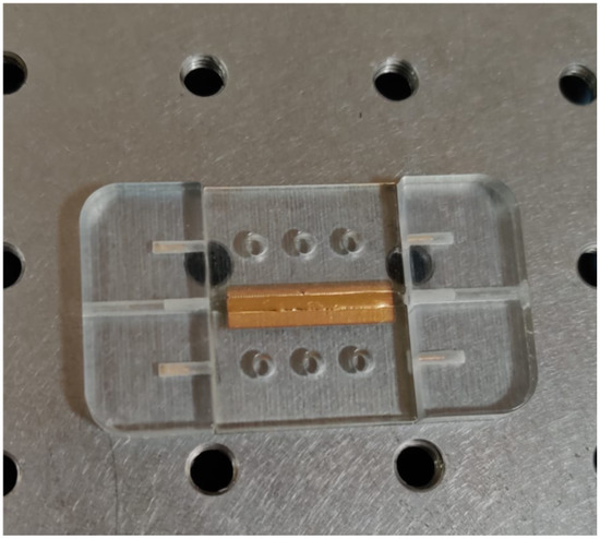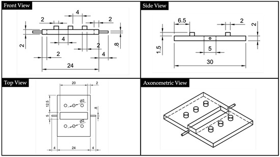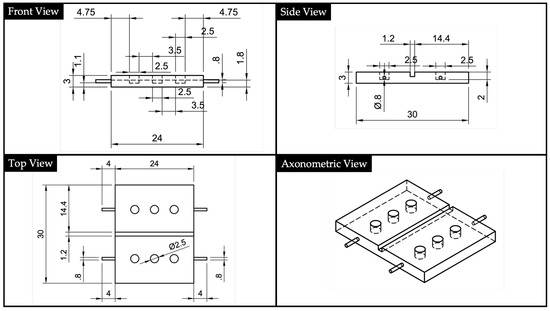 To ensure an appropriate insertion of the 1 mm POF waveguides, two supports were designed (Figure 6). The supports have square section channels with a dimension of mm, and they also have three holes to be coupled with the centering pins manufactured in the substrate and the cover. In fact, looking at Figure 6 it is possible to notice that laterally both have centering pins. The rationale to split the device’s body from the input and output ports is to avoid leakage of the liquid UV-curing adhesives into the channels used for POFs insertion. Channels with polymeric adhesive smears could negatively interfere with both the input light signal and acquired one at the output. Therefore, with our assembled manufacturing process, we avoid the presence of interface surfaces that can impair the light transmission.
