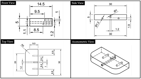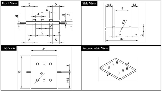 Based on the geometry of the substrate, a cover was designed with the aim of cladding the uncovered upper part of the core. Its geometry is reported in Figure 5. To improve the fitting between the substrate and the cover, suitable holes (for the substrate) and centering pins (for the cover) were designed allowing the centering of the two parts and avoiding the presence of an air layer.