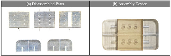 The 3D printed device was designed as an assembly of four different parts. In Figure 3 is represented a rendering of each part and of the device assembly. It was performed by using Autodesk® Fusion 360.