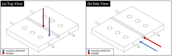 Measurements conducted from the top view in both VeroClear RGD 810 (a) and NOA88 (b).