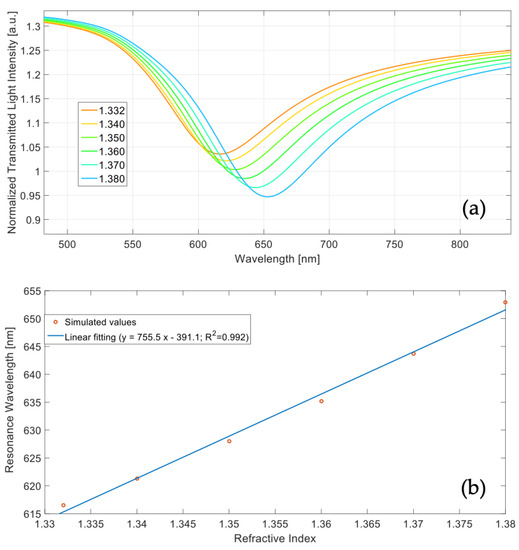 This numerical approach was based on an N-layer approximation and takes advantage of the transfer matrix formalism reported in [21]. Figure 14a shows the simulated SPR transmitted spectra at varying of the external refractive index (from 1.332 to 1.380), whereas Figure 14b reports the resonance wavelength as a function of the refractive index, together with the linear fitting of the simulated values.