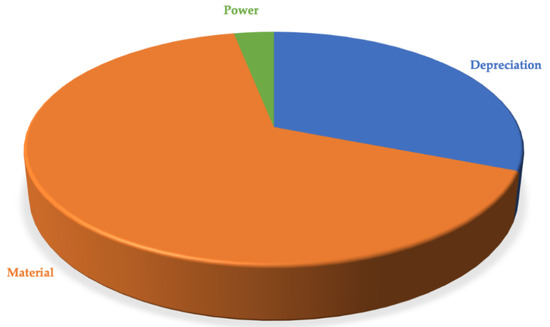 The material cost was modelled referring to the printing manufacturing that required, for hollow parts, the use of support material (FullCure705). The raw material cost and the quantities of material used for the printing of the whole assembled device, are reported in Table 3. The cost model used considered the depreciation of the machine used (3D printing), since the purchase, installation and maintenance costs of the same are known, the depreciation rate was also considered in the model. The power costs were considered while labour cost was not calculated as the operator is only required to spend a few minutes for print start and part removal from the platform. The power cost calculation considered the power requirements for the instrument used during the fabrication process, by considering as starting point the cost of power expressed in [€/kWh]. Having considered all these aspects discussed so far, the cost allocation was accomplished. The obtained results are shown in Table 4 and Figure 16.