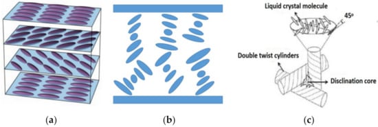 Cholesteric liquid crystals (CLCs) have one-dimensional twist structures with a continuous periodic distribution of molecules through the planar orientation of the interface [1]. The arrangements of LC molecules in CLCs consist of planar and focal conic states, which are shown in Figure 1a,b. When the linearly polarized light is incident on the cholesteric liquid crystal, its polarization direction is gradually twisted—that is, the plane of vibration of polarized light is rotated by virtue of the helical structure of CLCs [2,3]. However, when unpolarized light is incident, under the action of the helical structure composed of cholesteric liquid crystal molecules, the phenomenon of left or right rotation will be generated in the electric vibration vector of the light wave, and the light is divided into circularly polarized light with left/right rotation characteristics. The circularly polarized incident light with the same handedness as that of the CLCs is reflected, while that with the opposite handedness is transmitted [4]. The blue phase liquid crystals (BPLCs) appear as a regular array of double twist cylinders (DTCs) and the disclination lines among them exist in a narrow temperature range between the isotropic phase and cholesteric phase [5,6,7,8]. The arrangement of LC molecules in BPLCs is shown in Figure 1c. Due to the helical twist structures, both CLCs and BPLCs show Bragg reflection properties [9,10,11,12,13].