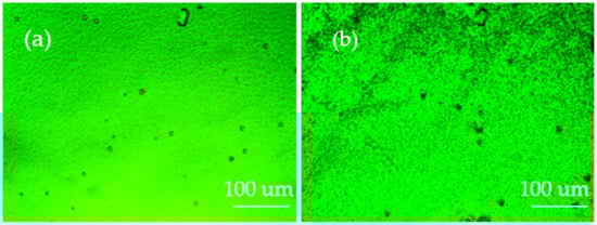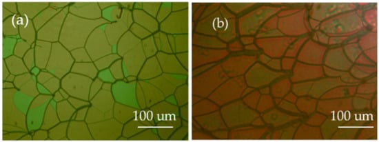 In order to obtain the BPLC template, we first added the material to a container according to the above ratio, and then put the container on the thermostatic magnetic stirrer. Raising the temperature to 80 °C and stirring for about 10 min, the material showed a transparent liquid shape, which means the material has been stirred well and the precursor of PS-BPLC was obtained. Then, we put the precursor on a temperature controller (HCS302, Intec, Boulder, Co., USA) and set the temperature controller to 80 °C in order to ensure that the precursor was added to the LC cell in an isotropic state, and used the capillary phenomenon to infuse the precursor into the anti-parallel LC cell with a thickness of 8 μm and area of 25 mm × 20 mm. Then, we observed the change of the LC phase state by lowering the temperature at a rate of 0.5 °C/min. The temperature range of the LC corresponding to the phase state was determined. Finally, we obtained the PS-BPLC by UV exposure (wavelength: 365 nm, exposure time: 10 min, exposure intensity: 3 mw/cm2). The platelet texture of the PS-BPLCs was observed under a polarized optical microscope (POM, XPL-30TF, Shanghai WeiTu Optics & Electron Technology Co., Ltd., Shanghai, China), as shown in Figure 2a. Then, the PS-BPLC cells were immersed in the organic solvent, acetone, for about 48 h to wash out the LC, chiral dopant, unreacted monomers, and photoinitiator. After evaporating on the temperature controller (temperature: 80 °C), the BPLC templates were obtained and the blue phase texture of templated-BPLC (T-BPLC) could be observed, as shown in Figure 2b. During to the fact that the central wavelength of PS-BPLC is in range of green, Figure 2 is green, which is irrelevant to the phase state. If the central wavelength is in range of blue or red, the texture figure will be blue or red.