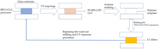 - Zha, S.; Zhang, H.; Sun, C. Multi-wavelength filters of templated blue phase LC. Crystals 2019, 9, 451. [Google Scholar] [CrossRef] [Green Version]