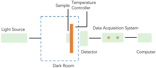 The spectral characteristics measurement system is shown in Figure 5. A tungsten bromide lamp was used as a non-polarized light source, providing a spectrum in the visible band. The light source signal is incident on the device, and the light intensity of the incident light signal is collected by the detector of the data acquisition system (DCS300PA, Zolix), and the transmittance curve is finally obtained by calculation. While the transmittance intensity of the transmittance spectra may be reduced by scattering or absorbing, the central wavelength, bandwidth, and the maximum transmissivity/reflectivity of the transmittance and reflectance spectra almost had the same values.