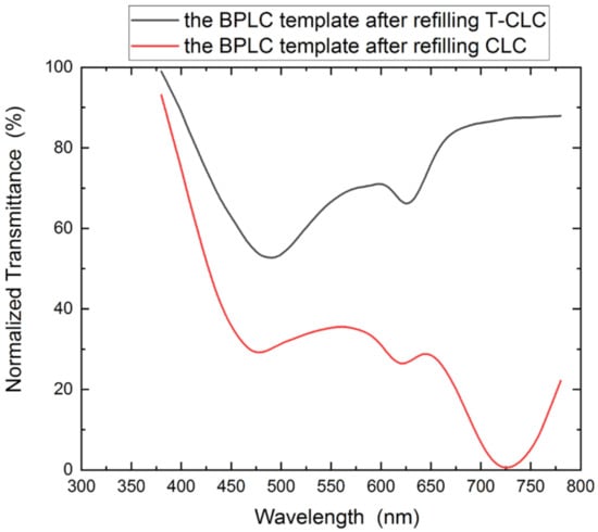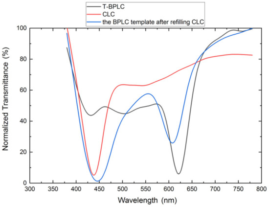A dual-wavelength LC filter was obtained by filling a CLC whose central wavelength is far from that of the intrinsic BPLC template into the template, and its transmittance spectrum is shown in Figure 6. The central wavelength of the templated BPLC and the CLC are 620 nm (black line) and 438 nm (red line), and the FWHMs are 54 nm and 62 nm, respectively; the two reflective peaks of the dual-wavelength LC filter are 608 nm and 446 nm (blue line). We may see that the two reflective peaks of the dual-wavelength LC filter are close to the central wavelength of templated BPLC and CLC, and only the band width increases a little. The results show that the dual-wavelength LC filter fabricated by the multi-refilling process maintains a good consistency with the design parameters.