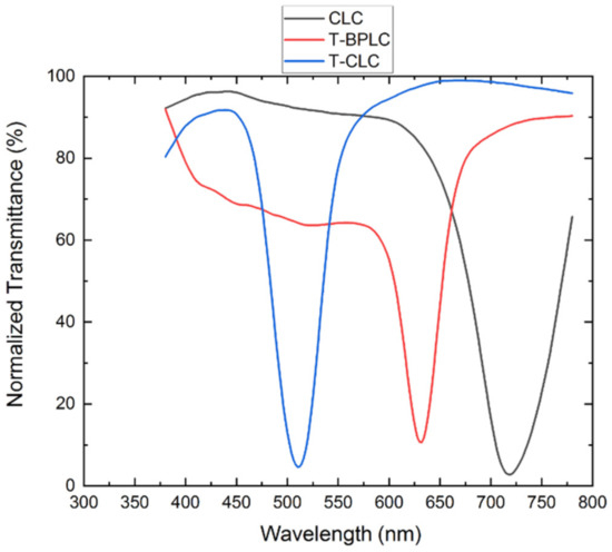 Transmittance spectra of T-BPLC, CLC, and dual-wavelength LC filter.