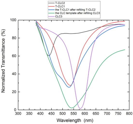 Firstly, the transmittance spectra of the T-CLC1, the T-CLC2, and the CLC were measured, as shown in Figure 9. Among them, the central wavelength of the T-CLC1 is 534 nm (red line), its FWHM is 111 nm, and the central wavelength of the T-CLC2 is 438 nm (black line), and its FWHM is 61 nm, the central wavelength of the CLC3 is 579 nm (purple line), and its FWHM is 82 nm. The central wavelengths of the T-CLC1, T-CLC2, and CLC3 are close to each other, which is suitable for the production of tunable bandwidth LC filters.