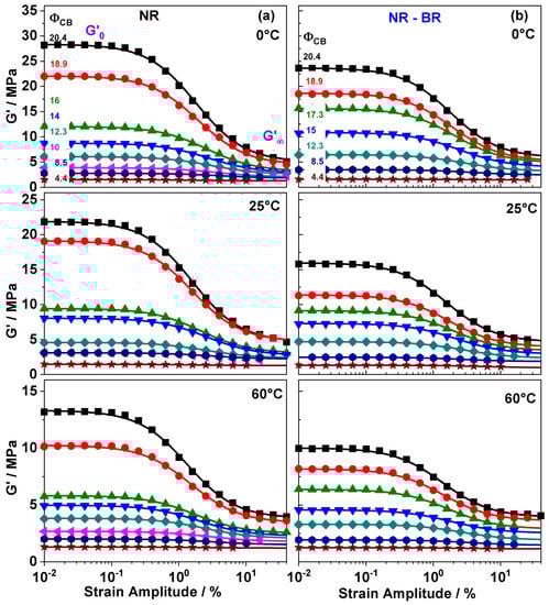 Dynamic storage modulus as a function of shear strain amplitude for (a) NR and (b) NR-BR composites containing varied fractions of carbon black (volume fractions are labeled in the upper plot). All measurements are done at 10 rad/s and temperatures of 0 C, 25 C and 60 C. The lines are fits based on the Kraus Equation (Equation (1)). The obtained values are given in Table 1. Experimental uncertainties of the mechanical measurements are of the order of symbol size.