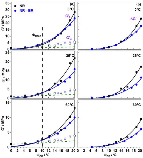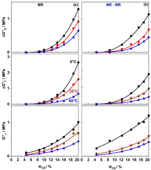 Kraus fits with approximate the experimental data for all investigated composites and conditions obviously quite well (Figure 1). The parameters taken from fits are presented in Figure 2. As expected, and show a weak dependence for filler fractions below 10%, while increases drastically above . This applies to both NR and NR-BR composites and for all investigated temperatures. The percolation threshold (), however, is similar for both investigated series and not significantly influenced by temperature. For highly filled composites the filler network contributions quantified by are significantly larger than those caused by hydrodynamic effects and occluded rubber related to [30]. The direct comparison in Figure 2b of both investigated series clearly shows that the values for NR composites are systematically higher than those of NR-BR composites for . This finding indicates that filler network contributions to reinforcement are significantly dependent on the rubber matrix. Interestingly, the values are almost same in both the series at a given temperature and filler fraction, showing that the filler network independent contributions to reinforcement are weakly influenced by the rubber matrix composition.The values are commonly a bit higher than the Guth–Gold prediction [30] probably due to occluded rubber contributions.