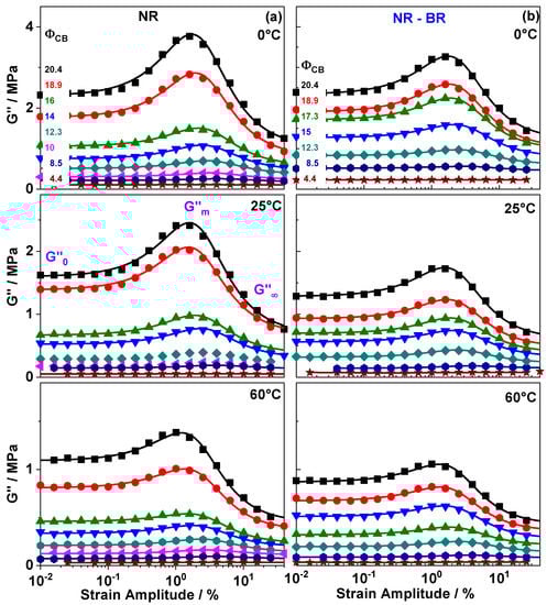 Figure 3a shows the strain dependence of dissipation, i.e., loss modulus for NR composites. As seen in for composites containing small amount of filler () practically no dependence on strain amplitude is observed although values do increase with slightly. In composites containing large amount of filler (), the values at small strain amplitudes ( < 1%) do raise strongly with increasing filler content. The values at large strain amplitudes ( > 25%) remain commonly significantly smaller. In addition, a peak is observed in at intermediate strain amplitudes that is a typical feature in composites containing percolated filler network. The peak height depends on filler fraction and temperature, as well as composition of the rubber matrix (Figure 3b).