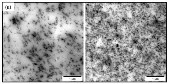 An arising question is why there are significant differences between the mechanical properties of rubber composites with NR and NR-BR matrix. In order to contribute to a better understanding of these differences TEM images have been prepared (Figure 5) for representative samples of both rubber composite series with = 4.5 vol.% as well as 15 vol.%. As expected, NR-BR composite show a two-phasic morphology where BR domains with a typical dimensions in the range of a few 100 nm are distributed uniformly in NR matrix. For both samples with lower filler fraction well dispersed filler aggregates are found throughout the matrix, which are isolated from each other. As the filler content is well below the percolation threshold, the level of filler dispersion can be identified via the aggregate size distribution. A comparison of representative histograms of the aggregate sizes for both samples with = 4.5 vol.% is given in Figure 6a. The differences regarding the aggregate size distribution and average aggregate size (0.017268 and 0.016395 m for NR and NR-BR, respectively) is relatively small for a given thickness of the cryomicrotomed sections of about 50 to 60 nm. The shape of the aggregates seems to be also preserved in both single and blend-based rubber composites. Although, the filler fraction = 4.5 vol.% is well below the percolation threshold, it is relatively complicated to quantify the localization of the filler in both rubber components. However, there seem to be clear indications for an over-proportional fraction of filler in the minority BR phase as seen in Figure 5b. A quantification of the filler dispersion in case of composites containing 15–16 vol.% of CB, i.e., amounts clearly above the percolation threshold, is much more complicated since the filler aggregates overlap and are connected to a percolating filler network. Comparative aggregate size distributions cannot be used any longer at such filler fractions. An attempt is made to quantify the filler dispersion in both single and blend composites based on the areas of the unfilled regions in TEM images for 50 to 60 nm thick sections. The unfilled regions are identified and measured by drawing polygons. The procedure is sketched in Figure 6d and the distributions of unfilled area sizes are compared for NR and NR-BR composites. The graph shows that the distribution of unfilled areas in the NR composite is not significantly different from that in the related NR-BR composite. The statistical average sizes obtained for 350 unfilled areas are 0.013931 m for the NR composite and 0.017843 m for the NR-BR composite, respectively. Another parameter that can be compared is the peak position in the histograms, which seems to also not be very different for both composites. This can be interpreted as a clear indication for an almost identical filler network topology above the percolation threshold for NR and NR-BR composites despite significant differences in the rubber matrix composition [32].