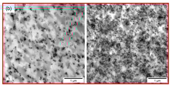 TEM micrograph (a) NR composites containing 4.5 and 16 vol.% CB as well as (b) NR-BR composites containing 4.5, 15 vol.%. Dark gray domains of BR domains are dispersed in light gray NR matrix.