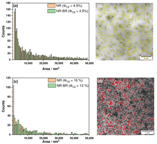 Histograms showing (a) the cluster size distribution for NR and NR-BR samples filled with 4.5 vol.% carbon black and the (c) size distribution of unfilled areas for NR and NR-BR composites containing 16 or 15 vol.%, respectively. In the TEM images, the identified filler clusters and the unfilled regions are highlighted by color for NR composites containing (b) 4.5 vol.% CB and (d) 16 vol.% CB, respectively.