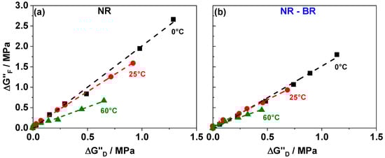 The fit lines in Figure 3 do evidence that Equation (2) also approximates well the experimental data for rubber composites with high filler fractions () investigated in this work. This applies to all three different temperatures and both matrices, i.e., NR and NR-BR composites. The obtained fit parameters allow us to quantify different contributions to dissipation. In particular, the filler network contribution to can be quantified using = − as well as = −. The intensity related to dissipation released due to breaking of the filler network [4,27] is increasing with increasing filler content since the peak height rises. Another common observation is that also raises with filler fraction since the values at small strain amplitudes are amplifying with increasing filler content. Measurements done at different temperatures show that with increasing temperature, both contributions, and , do decrease systematically.