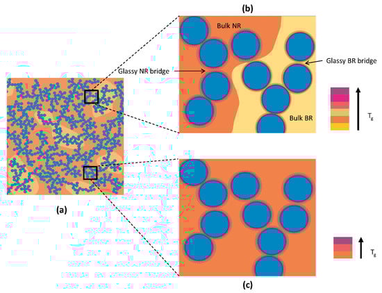 Since it is found that the filler network topology is only weakly influenced in case of the carbon black filled NR and NR-BR composites investigated in this work (Figure 6), the chemical composition of the glassy rubber bridges should be the main influencing factor causing the differences between both rubber composite series. Accordingly, it is straight forward to assume that changes in strength as well as dissipation result from the NR-to-BR ratio in the glassy rubber bridges. In blend-based composites, the NR in the glassy rubber bridges is partly replaced by BR with a significantly lower glass temperature . Assuming equal affinity of the filler to both rubbers, one would expect that about 30% of the glassy rubber bridges is composed of BR. However, this situation can vary, for example, due to different filler–rubber interactions. There are indications that CB prefers the BR phase in NR-BR blend composites [37,38]. Even if the properties of the glassy rubber bridges are hard to predict in detail since the reasons for the immobilization are related to the rubber-filler interaction directly at the interface, it seems to be a natural assumption that the glassy rubber bridges of the rubber with the lower bulk will also soften first during heating. The situation considered for NR-BR composites is sketched in Figure 8. A consequence of the discussed scenario is that glassy BR bridges sequentially soften first while those composed of NR start to soften at higher temperatures. This can explain why the load carrying capacity of the filler networks in rubber composites with NR matrix at application relevant temperatures is significantly higher compared to those in accordingly filled NR-BR composites. In the latter, the glassy BR bridges start to soften at lower temperatures accompanied by smaller volume of rubber in these glassy bridges under otherwise identical conditions. This volume argument can also explain the reduced dissipation contributions of the filler network in NR-BR composites although one has to mention that other properties, e.g., the difference between dissipation in the glassy and rubbery state, should also influence the absolute values of and . Following these arguments one can understand the observed trends comparing rubber composites with NR and NR-BR matrix. Recently investigated silica-filled SBR-BR composites with different blend ratios show basically similar trends. However, one should note that in case of silica-filled composites, the silane groups located at the filler surfaces should also influence the overall behavior. Whether or not is always the most relevant influencing factor remains open at that point and requires further investigations. In any case, there should be additional factors influencing reinforcement and dissipation in highly filled rubber blends. However, there are many evidences showing that the discussed fundamental points—filler network topology and chemical composition of glassy rubber bridges—determine mainly the filler network related contributions to reinforcement and dissipation [28]. To validate this hypothesis based on a broader assembly of rubber composites remains a challenge, but the trends in currently available examples allowing detailed comparisons are well in line with the formulated physical picture.