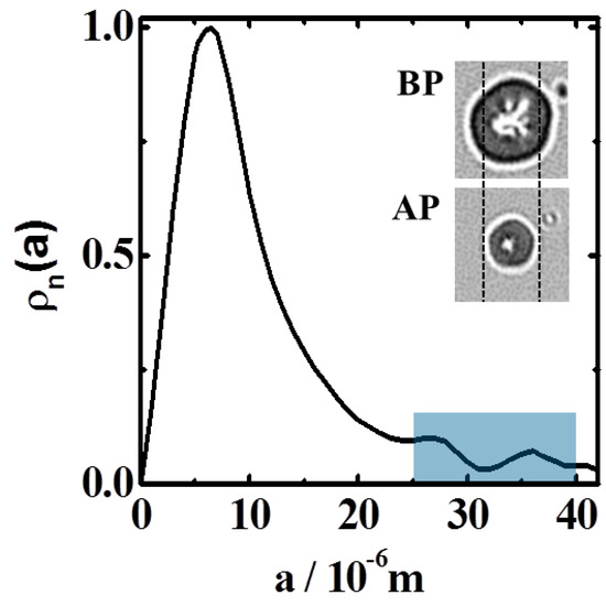 Particle number density distribution. Particles for experiments were selected from the right curve tail (marked rectangle). Pictures on the right inset (optical microscopy) illustrate the particle slimming caused by the application of plasma before (BP) and after plasma (AP). Dashed lines are visual references to observe the effect of mass removal.
