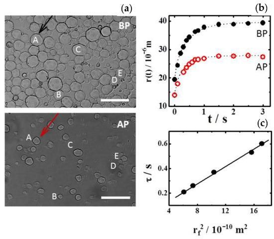 (a) Original (BP) and treated (AP) particles at the final swollen state. Bars correspond to 100 μm. Capital letters label the set of particles selected to characterize the radial density distribution and particle swelling dynamics. (b) Particle A at 20 °C tracked from collapsed to swollen state. Dotted curves are solutions of the Fick-like diffusion equation, fitted to the experimental data. (c) Time scale of the processes, τ, obtained from the fittings.