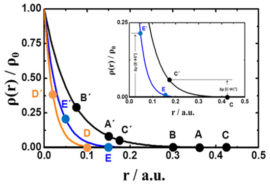 As deduced from Figure 2, particles E and D belong to different density curves (compared to A, B, and C). Since E and D exhibit the same diffusivities, and have similar diffusivities to the particles A, B and C, the borders of all particles (A, B, C, D and E) should be located at their respective low-density tails, as represented in Figure 5. Since the density distribution relaxes faster for small original particles, the density increments at the particles’ borders (after erosion) have to be larger for small original particles. See, for instance, how Δρ (E→E’) > Δρ (C→C’) in the Figure 5 inset. Consequently, the reduction of diffusivity by erosion should be greater for smaller original particles, as experimentally confirmed in Figure 4: ΔD (C→C’) < ΔD (E→E’). This scenario explains why particles with similar sizes may present different diffusivities depending on the procedure employed to reach that size. As an example, particle A’ has a similar size than particle E but exhibits much lower diffusivity. Its size comes from removing external material, thus showing a denser structure at the border, and consequently lower diffusivity.