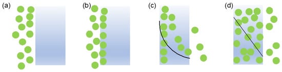 According to the structures of the membranes, they can be classified into two categories—nonporous (dense) membranes and porous membranes [14]. The solution–diffusion model is used to describe the transport behavior of vapor and gas through a nonporous membrane, by which it is assumed that no pores exist, and different gas molecules are separated based on their solubility and diffusivity inside the membranes [15]. In a solution–diffusion process, first, the upstream gas from the inlet (Figure 1a) come into contact with and dissolves in the high-pressure face membrane (Figure 1b). Then, the gas molecules diffuse through the membrane down a concentration gradient and desorb from the low-pressure face of the membrane (Figure 1c), where the diffusion is in a nonequilibrium state. Finally, as time goes on, eventually, the diffusion of gas reaches an equilibrium state (Figure 1d), and the one-dimensional gas flux (NA) across the membrane displays a linearity that can be described by Fick’s law [16]: