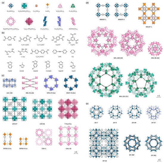 Representative MOFs for mixed matrix membrane developments. (a) Inorganic secondary building units (SBUs) and (b) organic linkers of MOFs. (c–e) MOF structures of particular interest to membrane-based gas separation applications. Reprinted with permission from [84], copyright 2020 ACS.