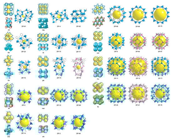 ZIFs, a subfamily of MOFs, possess a zeolite topology with tunable pore structures. ZIFs consist of point metal nodes in a center connected to imidazolate linkers, and can adopt numerous three-dimensional structures (Figure 6) [101]. Before now, 15 ZIF types have been found among 239 known types, and the relationship between imidazolates and topologies has been described in detail in the literature [102].