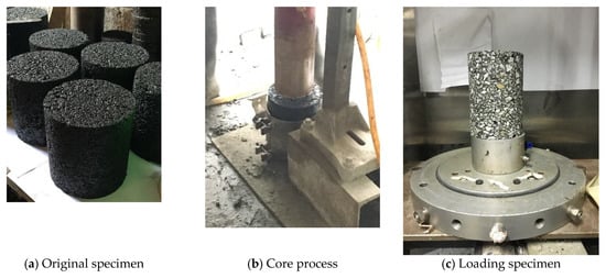 For the specimen formation of triaxial tests, the cylindrical specimen with a diameter of 150 mm and a height of 170 mm was formed by a rotary compactor (Pine Instrument Company, Grove City, PA, USA), and then the core specimen with a diameter of 100 mm and a height of 150 mm was obtained by drilling the cylindrical specimen. The specimen formation process is shown in Figure 2. Three parallel specimens were selected under the same testing condition.