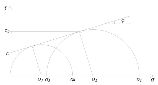 TCST can simulate the simple stress state of a point in the materials. The corresponding peak value of the vertical stress under the different confining pressures can be obtained by changing the gas pressure in the triaxial chamber. Then, according to the Mohr–Coulomb theory, a series of Mohr circles and corresponding tangent lines, considered the failure envelope, can be obtained. Furthermore, the values of cohesive force c, internal friction angle φ, and shear stress strength τ0 on the failure surface can be calculated. Specifically, the compressive strength σu and σ1 corresponding to zero confining pressure and non-zero confining pressure σ3 are obtained at the same temperature, and then Mohr semicircles (shown in Figure 4) are designed to obtain the parameters c, φ, and τ0, the calculation formula of which are as follows: