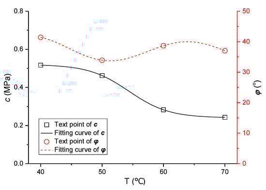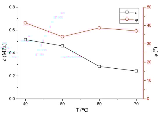 - The specimens were set to 70 °C, 60 °C, 50 °C, and 40 °C in the UTM-25 testing machine, respectively, and the shear strength parameters under three different confining pressures were obtained at each same temperature.