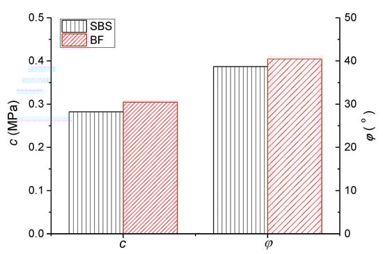 Combined with the engineering practice, to improve the high-temperature stability of the pavement mixture, asphalt mixture is evaluated by adding a certain content fiber [21,27,28]. Basalt fiber of 0.3% mixture weight was selected to add into the mixture to conduct the relevant studies, and results of the TCST at 60 °C after adding fiber are shown in Table 2. Meanwhile, the comparisons of shear strength parameters with and without fiber asphalt mixture are shown in Figure 7, where SBS represents the control specimen without fiber, and BF represents the specimen with basalt fiber addition.