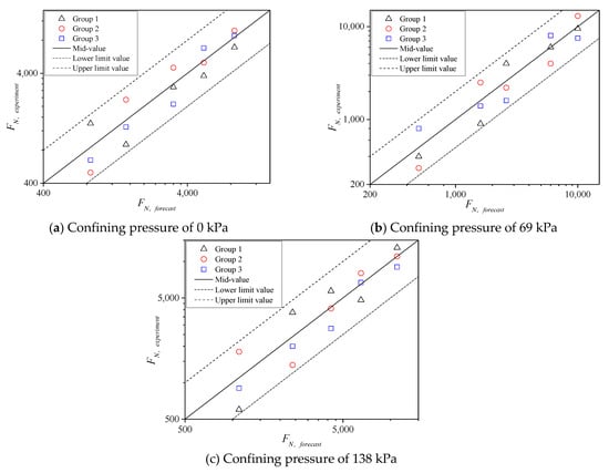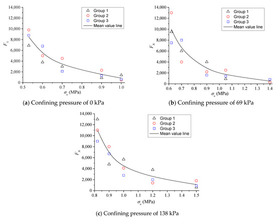 According to the results of Figure 10, the cyclic loading times FN of creep instability decreases exponentially with the increase in the vertical pressure stress levels σn under the same confining pressure. In addition, FN increases gradually with the increase in confining pressure at the same σn. Furthermore, validity analysis was conducted on the results of three groups of parallel tests under various confining pressures, i.e., the test results of FN corresponding to 15 specimens. The instability failure points fall in the dispersion band of twice the safety factors of the testing mean, as shown in Figure 11. Therefore, the results showed that FN values obtained from the testing are reasonable [26]. The σn of specimens subjected to the cyclic load is larger, the specimen is earlier closed to the failure state, and the dispersion of datum is relatively larger. As σn gradually decreases, FN values are closer to the median line, that is, the dispersion is also smaller. Generally, it is more reasonable for subsequent analysis.