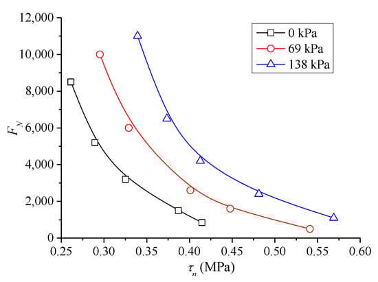 For the results of the TDCT at 60 °C, the mean value of FN was considered the creep life of asphalt mixture. Furthermore, according to formula (10), the relationship between shear stress level τn and creep instability of the mixture was investigated from the perspective of cyclic compression and shear failure, and the results are shown in Figure 12. The figure shows that, for the mixture under the same confining pressure, FN increases exponentially with the decrease in τn, and it tends to infinity when τn decreases to a certain extent. Thus, the entire process has an evident fatigue trend phenomenologically. In addition, the larger confining pressure indicates longer instability life and larger life limit of the mixture.