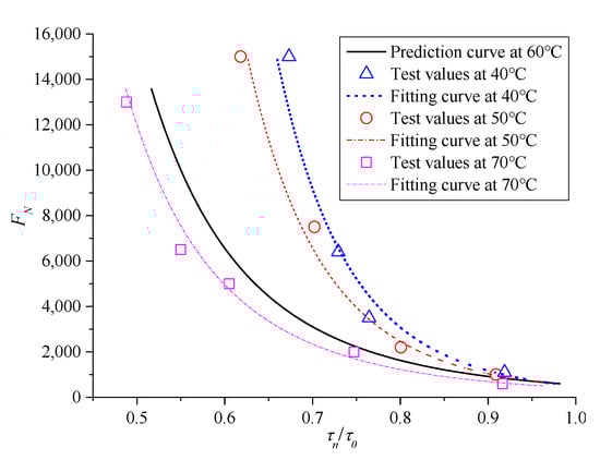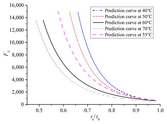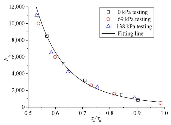 The ratio between τn and corresponding shear strength τ0 under the same confining pressure was introduced, namely, τn/τ0 is the X-axis of the relationship curve to obtain a relatively uniform instability prediction model for asphalt mixture, and the corresponding FN is still the Y-axis. Therefore, the resulting curve can eliminate the effect of different confining pressures, and the results are shown in Figure 13.