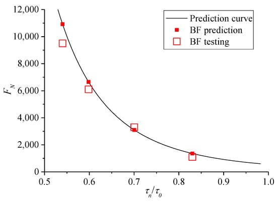 In the prediction model (11), τn and τ0 can be substituted by the formulas (10) and (8), respectively. Therefore, when the gradation of the mixture is unchanged, only the values of c and φ in the prediction model are measured, and a reasonable cyclic stress level σn under a certain confining pressure σ3 is given. Then, the shear stress ratio τn/τ0 in the prediction model can be obtained using formulas (10) and (8). Finally, the FN of creep instability under the corresponding stress state can be obtained by prediction model (11).