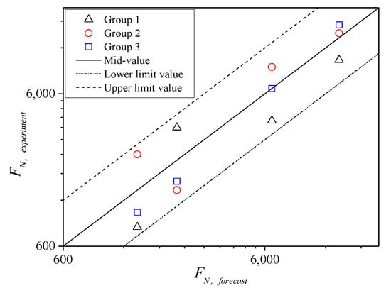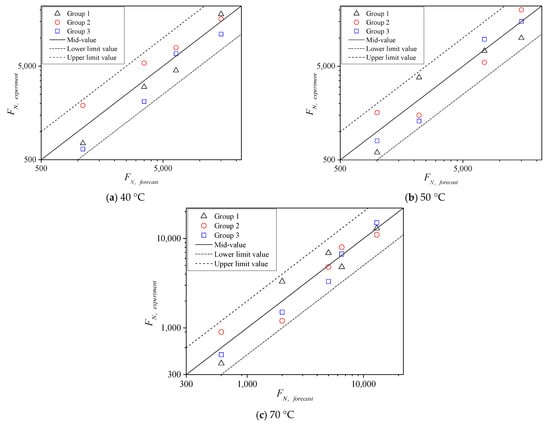 On the basis of shear parameters obtained from the TCST at different temperatures and the corresponding confining pressures, temperatures of 40 °C, 50 °C, and 70 °C were further considered to conduct the TDCT by setting compressive stress levels σn less than the corresponding compressive strength under the 0 kPa confining pressure (Table 1), where σn was set to 1.25, 1.4, 1.5, and 2 MPa for 40 °C; 0.9, 1.05, 1.25, and 1.5 MPa for 50 °C; 0.38, 0.43, 0.48, 0.63, and 0.85 MPa for 70 °C. Meanwhile, three parallel test results under each stress level were analyzed. FN falls in the dispersion band of twice safety factors of the test mean values, as shown in Figure 16, indicating that the tested FN values are reasonable.