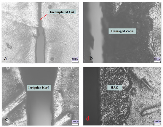(a) Incomplete cut. (b) Damage at the cutting zone. (c) Irregular kerf. (d) High extension of the heat-affected zone (HAZ).