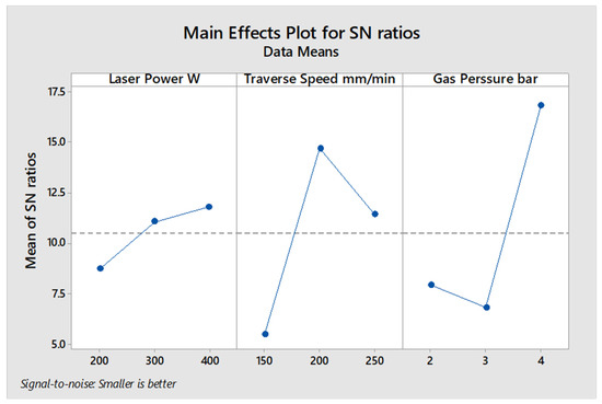 Based on measured response of the kerf taper angle in Table 7 for 2 mm material thickness, the average of S/N ratio for every input parameter was estimated and represented in Figure 3. At these conditions of input parameters values, the high gas pressure and laser power and medium traverse speed produce the optimum desired response of kerf taper angle. According to the max–min variation of S/N ratio that was calculated in Table 8, the significance of input parameters can be defined, as gas pressure ranked first as the most significant factor affecting the kerf taper angle, and traverse speed and laser power came second and third, respectively. Regarding to the ANOVA results that shown in Table 9, the contributions of the input parameters were 34.44% for gas pressure, 25.19% for traverse speed, and 2.93% for laser power. Based on Figure 3, 400 W laser power, 200 mm/min traverse speed, and 4 bar assist gas pressure are the optimum input parameters for cutting 2 mm material thickness of the SPF-UPE composite cut using CO2 laser beam cutting technology based on the desired response of the kerf taper angle. Based on average S/N ratio represented in Figure 3, and the small contribution of laser power, the medium value can be applied with no large effect because the variation in this parameter did not show an important effect on kerf taper angle response. Girish Dutt Gautam et al. [41] also found that the higher value of assist gas pressure produces the better response of kerf taper angle in cutting Kevlar/basalt fiber-reinforced hybrid composites cut with pulsed Nd:YAG laser cutting technology.