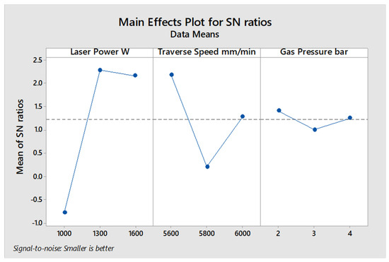Figure 5 demonstrates the average values of S/N ratio of every level of input parameters in accordance of measured kerf tape angle in Table 13 for 6 mm specimen thickness. The results did not show an important effect of assist gas pressure, while the laser power was the most important parameter in terms of affecting the kerf taper angle, followed by the traverse speed as shown in Table 14. It is observed in Figure 5, the higher values of the laser power and the lower values of the traverse speeds give the best response to the kerf taper angle, and this roughly corresponds to the case of 4 mm material thickness. ANOVA calculations in Table 15 show a significant contribution of the laser power of 81.2% to the effect on the kerf taper angle, while the effect of traverse speed was 13.57%, and the effect of assist gas pressure was very small, not exceeding 2.55%. Thus, 2600 W laser power, 7600 mm/min traverse speed, and 4 bar gas pressure gave the best response of the examined processing parameters for 6 mm plate thickness of the SPF-UPE composite cut with CO2 laser beam cutting technology.