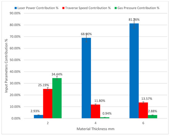 The contributions of the input parameters to the effect on the kerf taper angle of each material thickness are represented in Figure 6. In small material thicknesses (2 mm), gas pressure takes the largest contribution, as the higher value of assist gas pressure produce the better response of kerf taper angle as this is consistent with what Girish Dutt Gautam et al. [41] found, while traverse speed comes second in terms of effect on kerf taper angle and no significant effect of laser power was observed. This is in contrast to the larger material thicknesses (4 and 6 mm), where the laser power has the largest importance in affecting the kerf taper angle followed by the traverse speed with little effect of assist gas pressure. The best response of taper angle in the case of 4 and 6 mm is obtained with high and medium laser power and low traverse speed, which is consistent with what Ali Solati et al. [42] found, as this study did not demonstrate an importance of assist gas pressure. The high laser power and low traverse speeds allow a large possibility and time to complete the thermal decomposition of the material in the cutting area, and thus completely removing it by assist compressed gas, which may justify obtaining the best kerf properties under these conditions.
