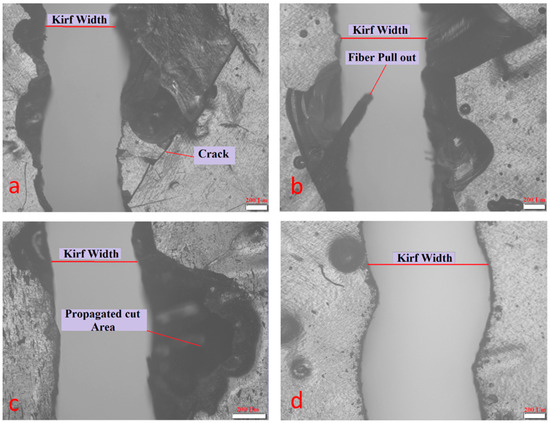 (a) Damages and cracks at cutting kerf. (b) Incomplete cut and pull out of fibers. (c) High propagated cutting area. (d) Uneven cut.