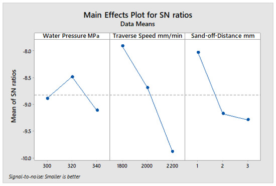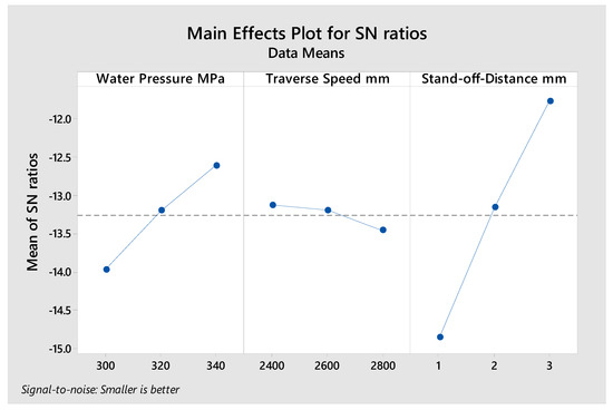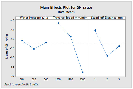 Based on the estimated S/N ratio of the measured kerf taper angle reported in Table 19 for 4 mm plate thickness, Figure 9 shows the average values of the S/N ratio for all levels of the input parameters. Under these conditions, the best responses of kerf taper angle were obtained by applying the low traverse speed, low stand-off-distance, and medium water pressure. In Table 20, the level of influence of input parameters were calculated by estimating the max–min variance of the average of S/N ratio, and based on the ANOVA results in Table 21, traverse speed ranked first as the most influential parameter on kerf taper angle with contribution of 61.20%, while stand-off-distance came second with contribution of 34.17%, and water pressure did not show an important effect with a contribution of 4.33%. Thus, 1800 mm/min traverse speed, 1 mm stand-off-distance, and 320 Mpa water pressure produced the optimum response of the examined processing parameters for 4 mm plate thickness of the SPF-UPE composite cut with waterjet cutting process based on the desired values of kerf taper angle response. Due to the small contribution of the change in water pressure to the effect on kerf taper angle, the lower value of the water pressure can be applied instead of the average value.