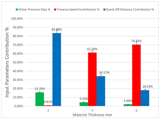 In the case of 2 mm material, stand-off-distance makes the largest contribution, as illustrated in Figure 11, which shows the contributions of the input parameters to the effect on the kerf taper angle response of each material thickness. The higher level of stand-off-distance (3 mm) gave the optimal response, as it is shown in Figure 7, which is consistent with what Kalirasu et al. [43] found examining various types of natural fiber reinforced unsaturated polyester, except that the stand-off-distance was not of large significance, contrary what was found in this study. In the cases of medium and large material thicknesses, traverse speed has the largest contribution followed by stand-off-distance with small effect of water pressure, as the lower levels of traverse speeds gave the best kerf taper angle response contrary to the result found by Arumuga Prabu et al. [1] that worked on Banana Fiber Reinforced Polyester Composite, but they found that the optimal response can be obtained with applying the lower levels of stand-off-distance similar to what found in this research. In the cases of 4 and 6 mm material thicknesses, better kerf taper angle can be achieved at a low traverse speed, and low standoff distance, which is consistent with most of the studies surveyed by R. K. Thakur et al. [44].