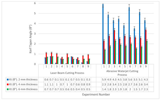 A comparison can be drawn between both cutting processes in terms of the kerf taper angle value and its relationship to the thickness of the material. In Figure 12 the kerf taper angle response of every single experiment number for both processes is represented. The figure clearly shows that the values of the kerf taper angle in the case of laser cutting process were much less than in the case of waterjet cutting process, but the abrasive waterjet cutting process produced an acceptable response compared to the results that have been found in some previous researches, such as the studies conducted by Arumuga Prabu et al. [1] and Kalirasu et al. [43]. It is also noted that the lowest kerf taper angle response was recorded at the lowest material thickness in the case of laser cutting process, contrary to the case of abrasive waterjet cutting process in which the largest responses of the kerf taper angle were recorded at the same material thickness, which may be due to the large erosion caused by the waterjet and the abrasive grains. It is also noted that the specimen with the smallest thickness (2 mm) is subjected to a significant amount of vibrations, which may contribute to the growth of the kerf taper angle in the case of abrasive water jet cutting process, meanwhile the other specimens were more rigid under the process conditions, and this may explain the decreasing in the kerf taper angle with the increase in the material thickness. In the case of the laser cutting process, the largest average of kerf taper angle values was recorded at the thicker material (6 mm), which may be because the farther parts of the material along the depth of the cut may be exposed to less amounts of heat, which makes this area less decomposing than the higher areas, where the laser beam is focused at the upper surface of the material, which makes the cut at the top wider than the bottom, leading to an increase of the kerf taper angle values.