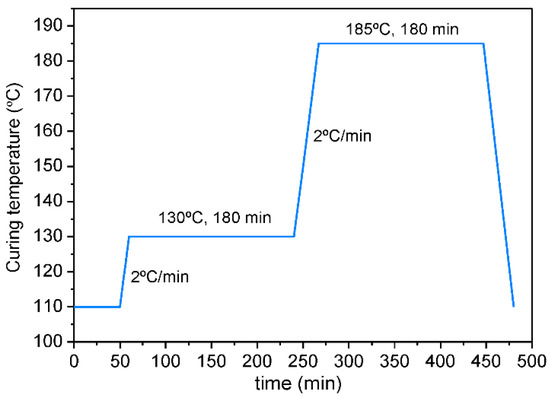 Graphene/benzoxazine nanocomposites were prepared by means of three-roll calendar (Exakt 80E GmbH) in seven steps optimized by Moriche et al. in previous studies [16]. The gap between each pair of rolls was reduced in every step progressively maintaining a constant rolling speed of 250 rpm. In addition, rolls were water heated at 50 °C in order to reduce the viscosity of the resin. Afterward, dispersions were degassed in a vacuum at 105 °C for 15 min. Two nanocomposites with 0.5 and 2 wt.% of GNPs were prepared. These mixtures were poured into steel molds, previously treated with a mold release agent, and then cured in an oven according to the cure cycle suggested by the resin’s manufacturer (Figure 1). Finally, nanocomposites were demolded and post-cured in an oven at 200 °C for 1 h.
