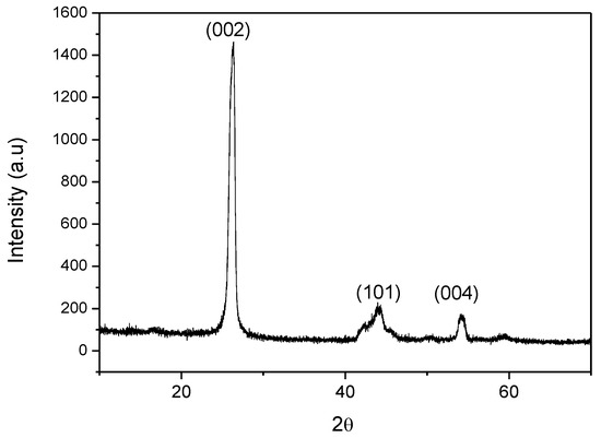 X-ray Diffraction of commercial graphene nanoplatelets was performed to prove their purity and crystalline structure. The diffraction pattern (Figure 2) showed a sharp peak at 2θ ~ 26.3° corresponding to a d-spacing of 0.339 nm that is related to the graphitic plane (002). The presence of this peak allowed confirming that graphene nanoplatelets have not been completely exfoliated. Scherrer equation [17] was employed to estimate the average domain size from the broadened diffraction peak (002), obtaining a thickness for the GNPs of 12 nm which was double to that indicated by the supplier (lower than 6 nm). In addition, it is worth noting that the thermal and electrical conductive properties of graphene nanoplatelets are closely related to the in-plane crystalline size (La). From the Scherrer expression, this crystalline parameter could also be achieved (30 nm) [18] and this result was considerably lower than the manufacturer datasheet (15 µm) because the crystalline domain is lower than the particle dimension.