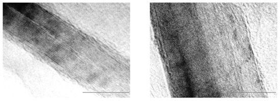 TEM analysis was carried out with the aim of verifying the thickness of GNPs (Figure 3) by measuring directly on these micrographs. As it can be appreciated, the particle thickness was statistically in the range of 10–15 nm which is in accordance with the results achieved by XRD.