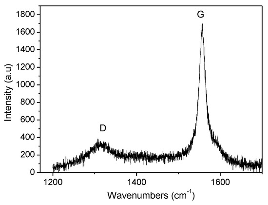 Raman spectroscopy is a powerful tool to evaluate defects and residual stresses in graphene nanoplatelets. Figure 4 shows the Raman spectrum of GNPs where two characteristic bands can be appreciated. The pronounced G peak at 1157 cm−1 is associated with in-plane vibrations of sp2 bonds in both rings and chains. The other dominated band which is known as de D-band was around 1350 cm−1 and it is related to the sp3 defects of the carbon atoms [16,19]. The relation between the intensity of both bands (ID/IG) determined the density of defects, so a higher ID/IG ratio implies a major density of defects in the structure. Obtained value for these GNPs was 0.15 which confirmed the elevated purity of these GNPs. Moreover, this result was only slightly lower than that acquired by Chiu et al. for the same type of graphene nanoplatelets [20]. From the intensity ratio of the G and D bands the in-plane crystalline size can be also calculated following the relation La (nm) = 4.4 (IG/ID) [21,22]. The La value obtained for GNPs was 29 nm which was very similar to that determined by means of XRD.